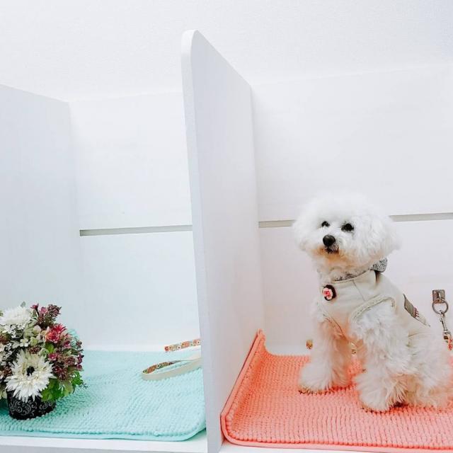 ワンちゃんが不安にならないよう、トリマーの目の届くところに、ワンちゃんのお預かり・お立ち台ゾーンがございます。