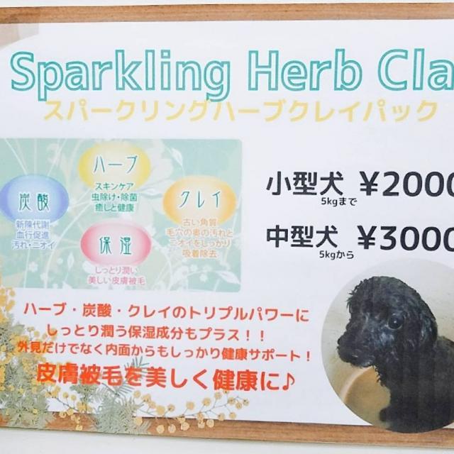 トリミングにプラスしてオススメなのが、スパークリングハーブクレイパックです。ハーブ・炭酸・クレイのトリプルパワーに加えて、保湿成分がプラスされました。汚れやにおいを落とし、血行を促進、保湿効果で、皮膚や被毛を美しく健康にする効果が!ぜひ、トリミングと併せてご利用ください。小型犬(5㎏まで)¥2000 中型犬(5㎏から)¥3000