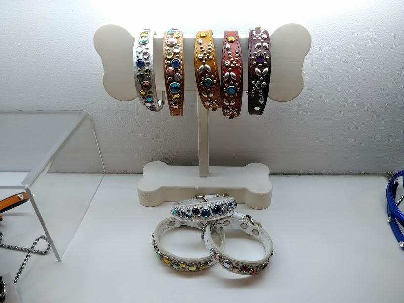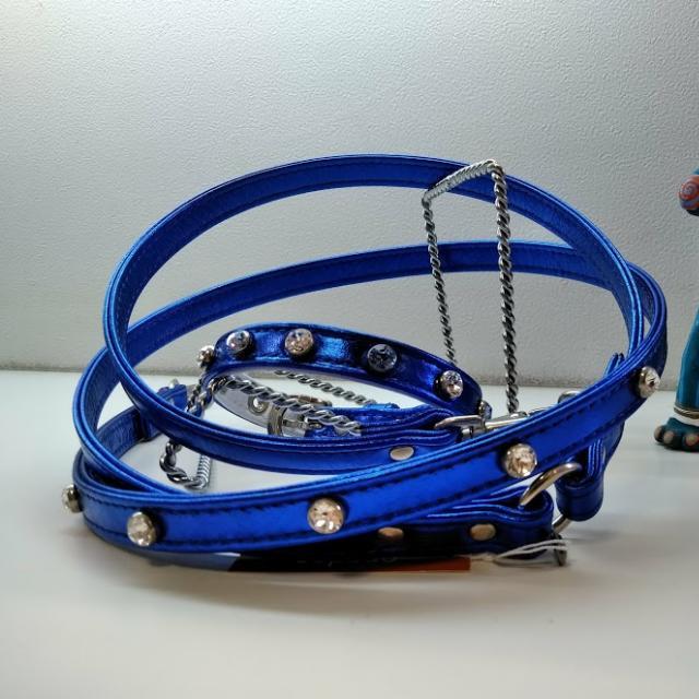 一番の特徴のオーダーメイドのリードや首輪。2つの国内のアトリエのデザインを取り扱っており、革は勿論、スタッズも選べますので、あなたのワンちゃんのオンリーワンが作れます。こちらが、1つのアトリエの商品です。メタリックブルーが素敵です。様々なワンちゃんに似合うと好評です♪